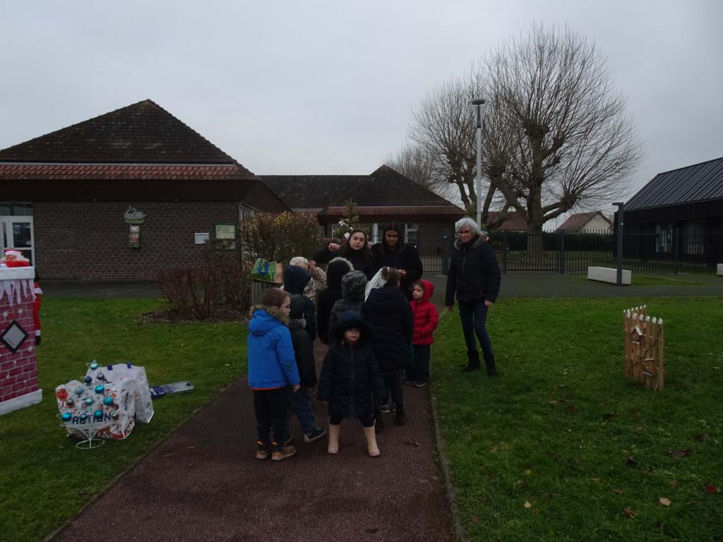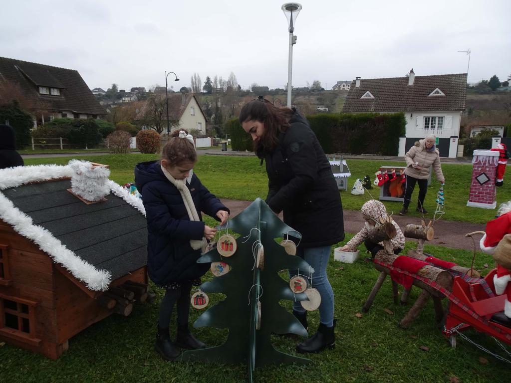 Léquipe " Embellissement & cadre de vie" et les enfants du Centre de Loisirs posent les décors sur la place des Saules