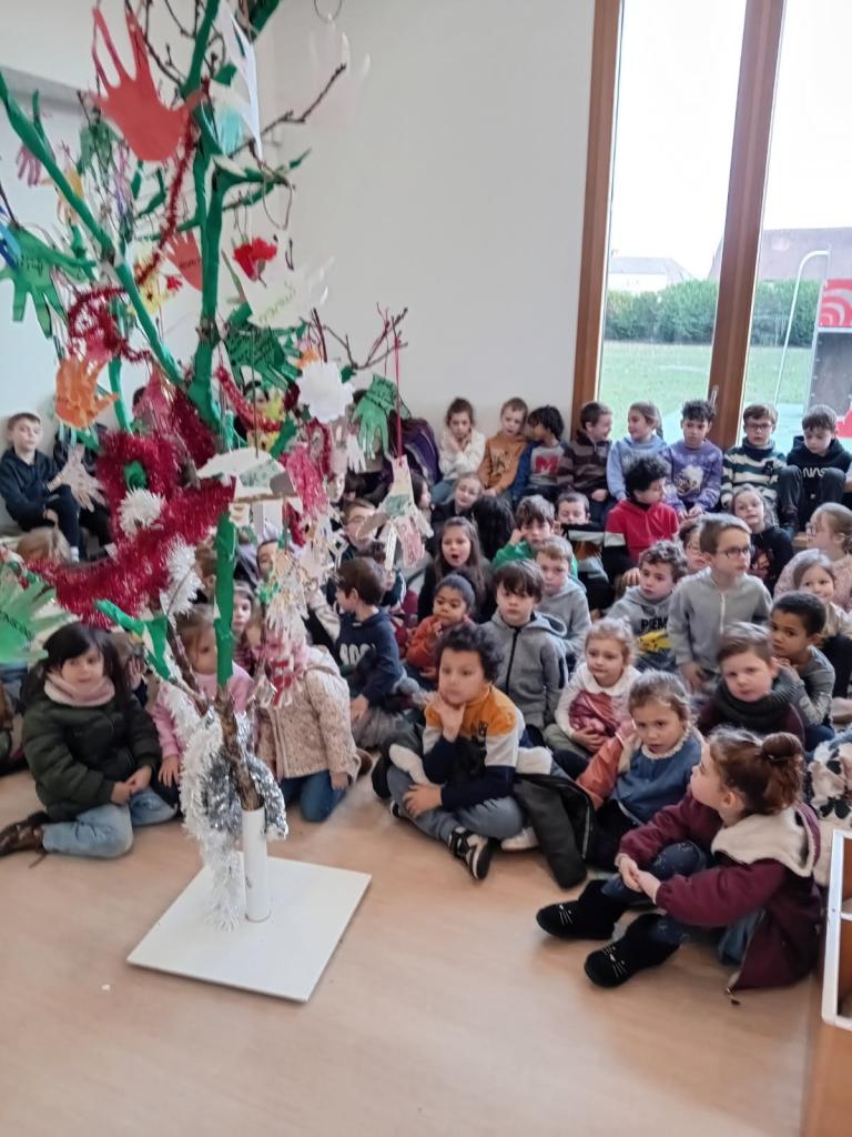 Toutes les classes de l’école primaire accompagnées de l’équipe enseignante, d’accompagnantes et de la bibliothécaire se sont réunies à la médiathèque autour d’un arbre conçu pour fêter les 120 ans de la Laïcité (La séparation des Églises et de l'État actée le 9 décembre 1905).