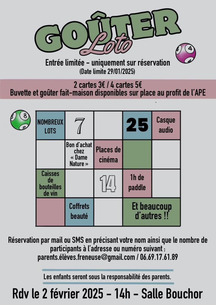 goûter-loto organisé par l’association de parents d’élèves (2 cartes 3€, 4 cartes 5€, buvette de goûter fait maison au profit de l’APE), De nombreux lots à gagner !