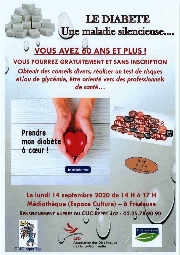 Le 14/09 de 14h à 17h dans l’Espace Jeunesse et Culture, place des Saules, le CCAS et le CLIC-repèr'âge, organisent une campagne de sensibilisation et de prévention sur le thème du "Diabète" à destination des personnes âgées de 60 ans et plus.